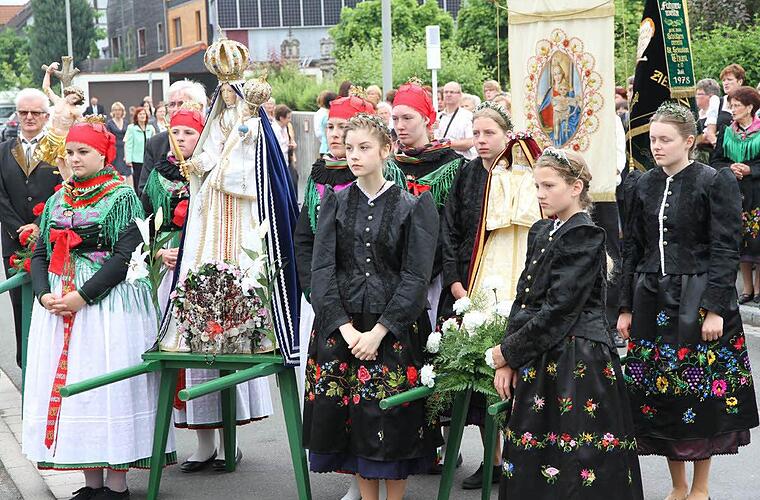 Der Schützenverein trägt die Statue des Heiligen Sebastian, die Mädchen des Trachtenvereins tragen Statuen von Maria und der Mutter Anna.
