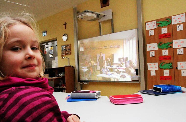 Die Zeit, als Folien gebrannt werden mussten, ist damit endgültig vorbei. Außerdem gebe es immer mehr Software für den interaktiven Beamer, der richtige Lösungen mit einem "Ausgezeichnet" oder "super" verstärkt. Da Arbeitsblattvorlagen und Lösungen abgespeichert werden, können die Kinder am nächsten Tag wiederholen und den Lernerfolg selbst kontrollieren.
