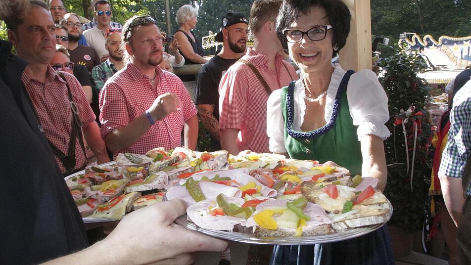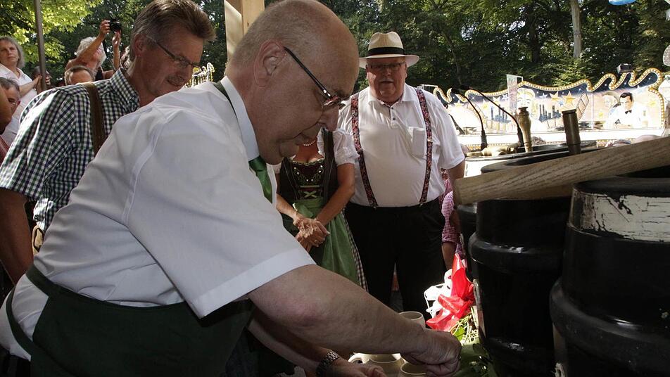 Dann kam Stumpf einer seiner schönsten Pflichten nach, wie er freimütig bekannte. "Oogschdochn is!", verkündete das Stadtoberhaupt nach drei kräftigen Schlägen, mit denen er den Zapfhahn in das Holzfass trieb. Traditionell brachten daraufhin Oberbürgermeister Franz Stumpf, Bürgermeister Franz Streit und der Pächter des Schindler-Kellers, Hans Schmitt, das erste Fass Freibier unter die Zaungäste, die bereits kurz vor 17 Uhr den Platz zwischen dem Schindler-Keller und dem Riesenrad gefüllt hatten und den Bieranstich hautnah miterleben wollten. Inge Schmitt, die Gattin des Keller-Betreibers, spendierte dazu belegte Brote.