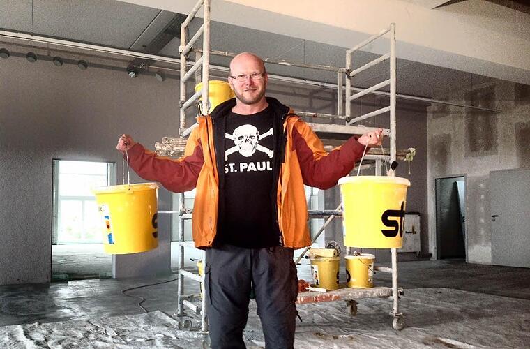 Die zwei Farbeimer stemmt Jörg Wiemann wahrscheinlich auch im Schlaf. An den ist derzeit für den Muskel- mann nicht zu denken.