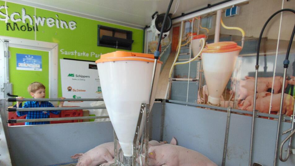 Mit einem Luftballon in der Hand stiegen sie die Stufen des Schweinemobils hinauf und staunten, wie eng aneinandergedrückt die kleinen Schweinchen ihren Mittagsschlief hielten. Auf der gegenüberliegenden Seite informierte ein Stand über akkubetriebene Heckenscheren mit Schutzhandschuhen . Nur wenige Meter davon entfernt auf einer größeren Wiese waren Traktoren und Anhänger ausgestellt. Nicht nur für die kleinen männlichen Besucher war dies ein Augenschmaus und fand ebenso großen Anklang bei den Besuchern wie die Eisenbahn, die in einem Hof aufgebaut war und unter Begeisterungsrufen der Kinder ihre Runden drehte.