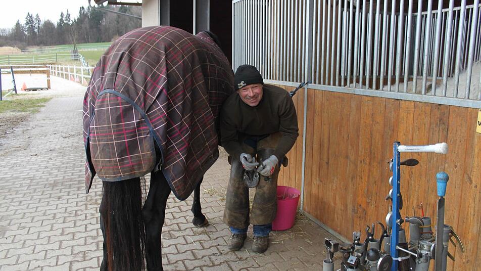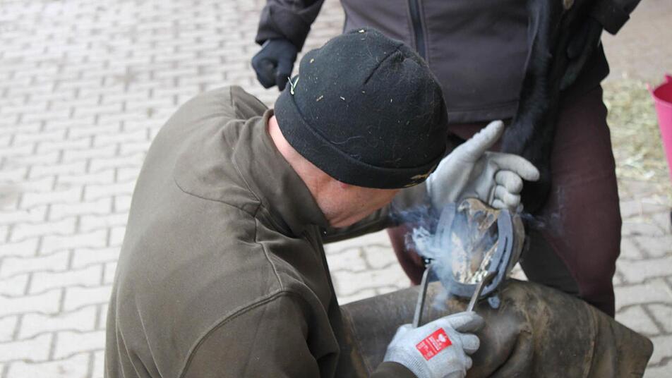 Unruhig trippelt "Windspiel Girl" hin und her. Sabine Gilligbauer hat ihr Pferd, das sie nur "Mausi" nennt, aus der Box geholt und außen am Stall angebunden. "Windspiel Girl" weiß, was jetzt auf sie zukommt: Sie bekommt von Hufschmied Stephan Hellgrewe neue "Schuhe" verpasst.