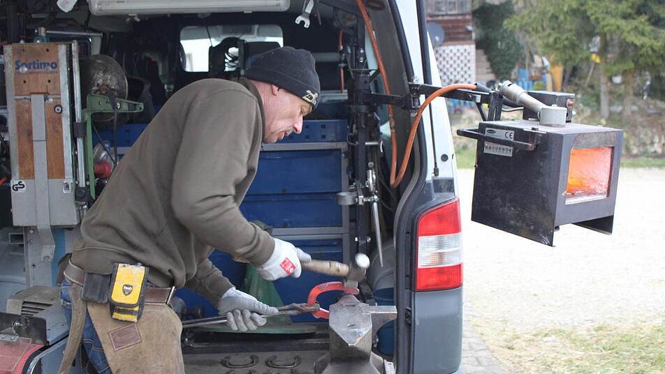 Mittlerweile erhitzt Hellgrewe die vier Hufeisen in einem speziellen Ofen, der an seinem Auto ausgeklappt werden kann. "Die Investitionen für einen Hufschmied halten sich in Grenzen. Man braucht ein Auto, einen Amboss und etwas Werkzeug, dann kann man loslegen", informiert Stephan Hellgrewe, der lieber im Freien mit Tieren und ihren Besitzern arbeitet als im Büro oder in einer Fabrik am Band.