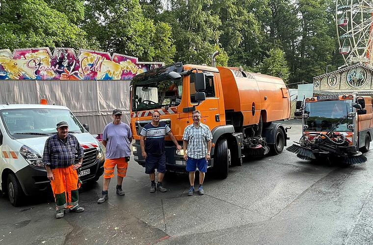 Damit es am Morgen nach dem abendlichem Feiern in Forchheims grünen Wohnzimmer auch nach Wohlfühl-Wohnzimmer aussieht, sind die „Saubermänner“ des Forchheimer Bauhofs bereits in aller Früh am Arbeiten. Tagaus, tagein, samstags und auch sonntags jeden Tag ab 6 Uhr bis 11 Uhr sind sechs Mitarbeiter von der Piastenbrücke über die Konrad- und Hans-Sachs-Straße, Leygeberstraße und natürlich am Annafestgelände unterwegs, kehren die Zufahrtsstraßen, fegen die angrenzenden Wege, leeren Papierkörbe, schichten Müllsäcke.