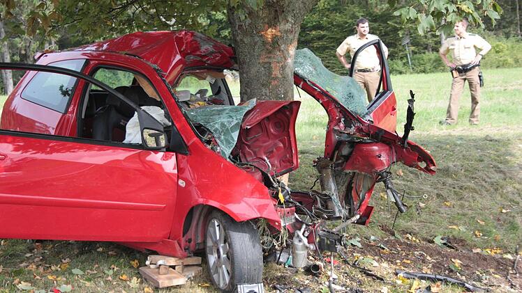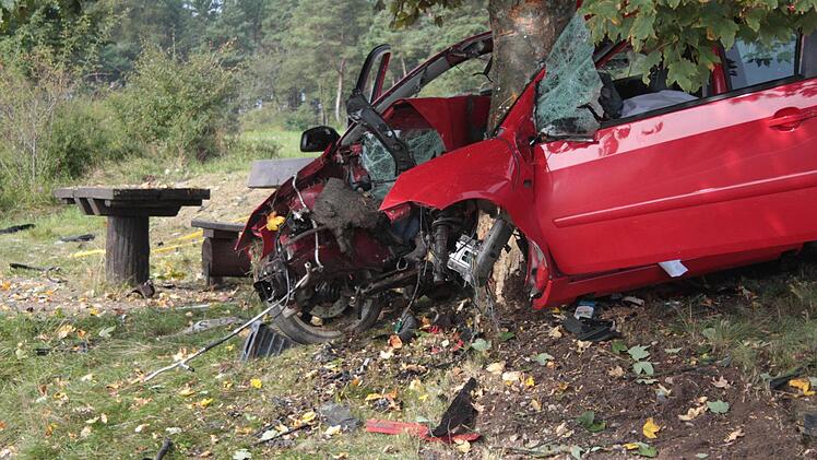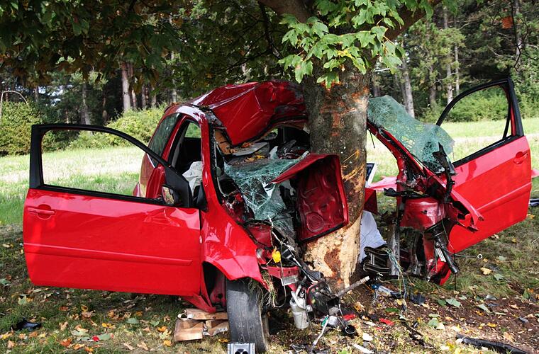 Die Wucht des Aufpralles, bei dem sich der rote Ford Fiesta um den mächtigen Stamm wickelte, muss enorm gewesen sein. Der Stamm bohrte sich bis zu den Vordersitzen in den Wagen.