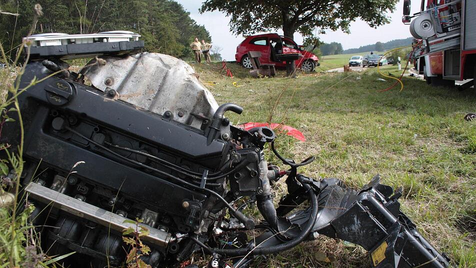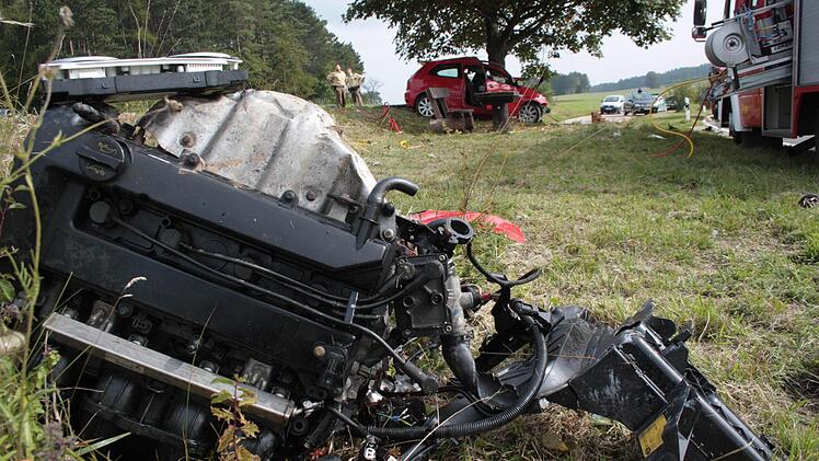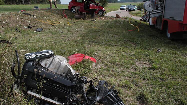 Enorme Wucht Wie unvorstellbar heftig der Aufprall gewesen sein muss verdeutlicht die Tatsache, dass der komplette Motorblock inklusive Tacho herausgerissen wurde und 50 Meter weiter im Feld lag. Das linke Vorderrad, das ebenfalls abgerissen wurde, lag 200 (!) Meter weiter in einer Wiese. Auch das Steuer wurde herausgerisssen. es lag einige Meter vor dem Wrack.