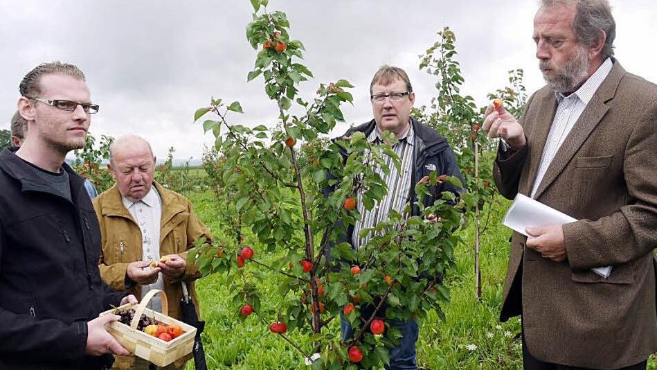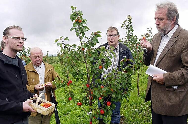 Die Körbchen mit Kirschen und Aprikosen auf dem Tisch der Unterstellhalle verlocken zum Naschen. Und noch viel mehr die zweijährigen Bäumchen im Versuchsgelände, die voller rotgoldener Früchte hängen. Herr über diesen Paradiesgarten ist Hans Schilling.
