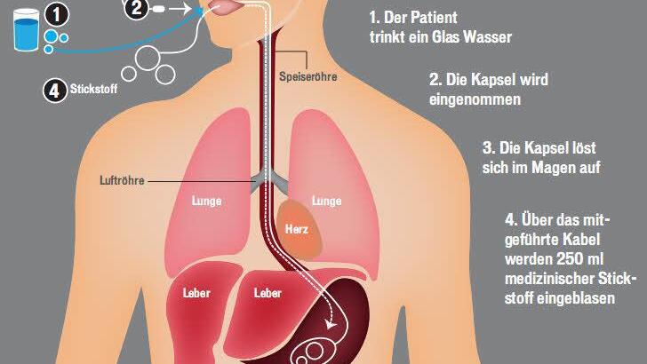 "Das Verfahren ist ganz einfach", erklärt Bernhard Drummer. Erst bekommt der Patient ein Glas Wasser. Dann schluckt er die Kapsel, eine etwas größere Pille, die sich im Magen auflöst. Dann wird in den frei gelegten Ballon über das mitgeschluckte Kabel 250 Milliliter medizinischer Stickstoff hineingeblasen. Fertig. Die ganze Prozedur dauert gerade mal 20 Minuten, kann also ambulant durchgeführt werden, ersetzt aber keine Gastroskopie.