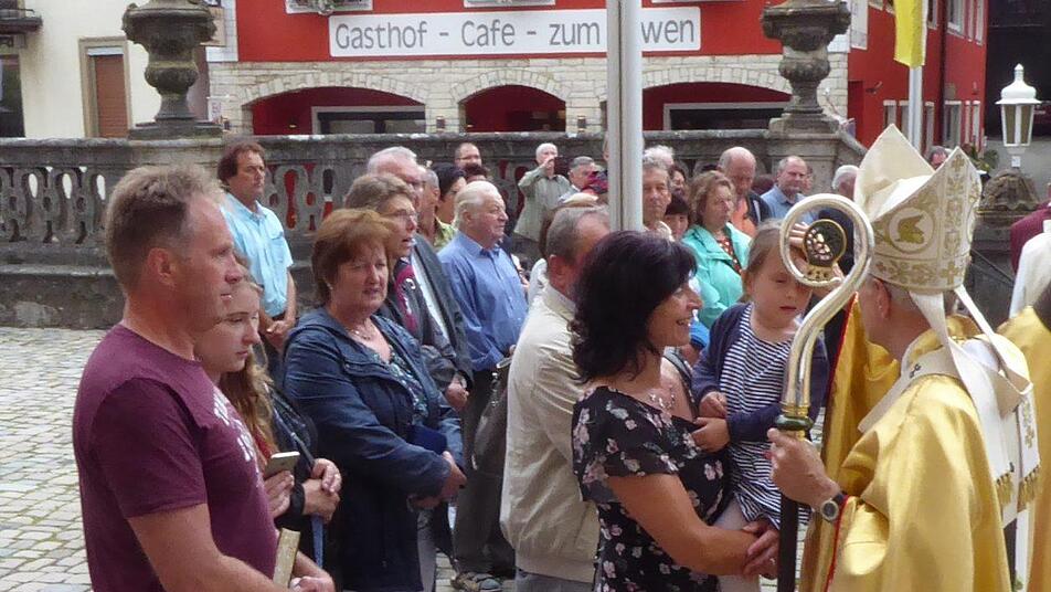 "Sei gelobt und hochgepriesen", tönte der Lobgesang zu Ehren der Heiligsten Dreifaltigkeit durch die Basilika Gößweinstein. Zum Patronatsfest war der Bamberger Erzbischof Ludwig Schick gekommen, um mit den zahlreichen Wallfahrern, besonders den Weilersbachern, und den Pfarrangehörigen Gottesdienst zu feiern. In seiner Begrüßung wies Erzbischof Schick darauf hin, dass jeder Gottesdienst wie eine Wallfahrt sei: "Zur Wallfahrt gehört beten, singen, schweigen, hören. Nichts anderes machen wir auch beim Gottesdienst." "Gößweinstein hat schon etwas Besonderes", sagte der Bischof in seiner Predigt. An Wallfahrtsorten werden Heilige wie die Gottesmutter Maria, Jakobus oder auch die Vierzehnheiligen verehrt. Auf das Geheimnis der heiligsten Dreifaltigkeit werde zunächst mit Unverständnis, dann aber auch mit Neugier reagiert. In Gößweinstein werde das Geheimnis ein Stück weit offenbar. Wie schwierig dieses Geheimnis zu ergründen sei, machte er an der Begegnung des heiligen Augustinus mit dem Knaben am Meer fest. Der Knabe hatte eine kleine Grube im Sand gemacht und wollte mit einem Löffel das Meer in die Grube füllen. Dies sei so unmöglich wie das Geheimnis der Dreifaltigkeit zu erklären. Der Oberhirte erklärte: "Gott ist Kommunikation. Ohne Gespräch verliert der Mensch sein Menschsein." Der Erzbischof Schick betonte: "Die Heiligste Dreifaltigkeit soll Richtschnur für unser Leben sein." Daher sei Gößweinstein so wichtig und müsse als geistlicher Ort erhalten bleiben. Begrüßt wurde Schick von Kindern des Kindergartens St. Franziskus. Dessen Leiterin Irmgard Redel hatte mit den Kindern ein Gedicht vorbereitet. Für die Pfarrei Heiligste Dreifaltigkeit Gößweinstein sprach Pfarrgemeinderatsvorsitzende Kathrin Heckel. Als Konzelebranten feierten mit dem Erzbischof die Franziskanerpatres Pfarrer Flavian Michali, Wallfahrtsseelsorger Pater Aurelian Ziaja und Pater January Sliwa den Pontifikalgottesdienst. Die Lesungen und die Fürbitten wurden abwechselnd vom Weilersbacher Wallfahrtsführer Norbert Seiler und Kirchenpfleger Georg Lang vorgetragen. An der Orgel gestaltete Georg Schäffner virtuos den Gottesdienst mit. Während des Auszugs von der Basilika zum Pfarrhaus segnete Erzbischof Schick Kinder, Alte und Kranke. Den Ein- und Auszug des Erzbischofs begleitete der Musikverein Gößweinstein unter Leitung von Jürgen Hiltl. Die Freiwillige Feuerwehr Gößweinstein sorgte mit der kurzzeitigen Absperrung der Straße für Sicherheit. Im Pfarrgarten konnten Wallfahrer und Pfarrangehörige in der Begegnung mit Erzbischof Schick ihre persönlichen Anliegen vorbringen.