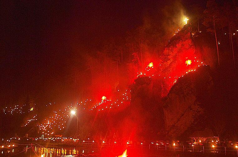 Die rund 5000 Lichter und Feuer, darunter etwa 3000 Wachslichter und bengalische Leuchtfeuer, auf den Berghängen und im Ort brannten wie gewohnt, es war jedoch nasskalt und was für die Romantik wieder einmal fehlte, war der Schnee.