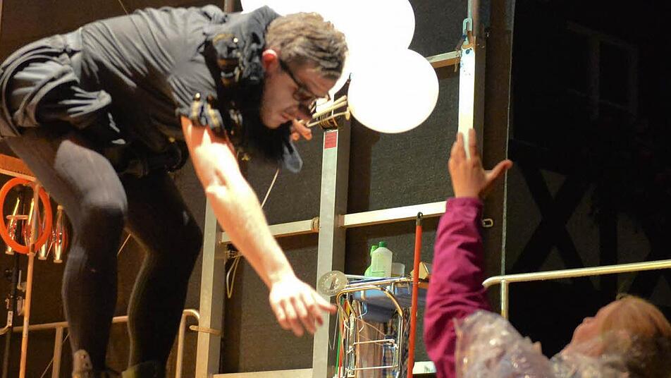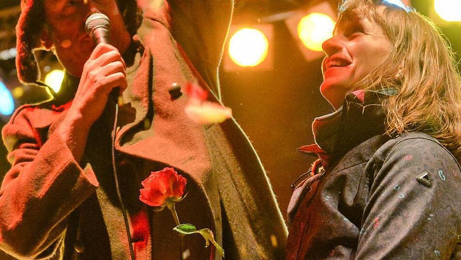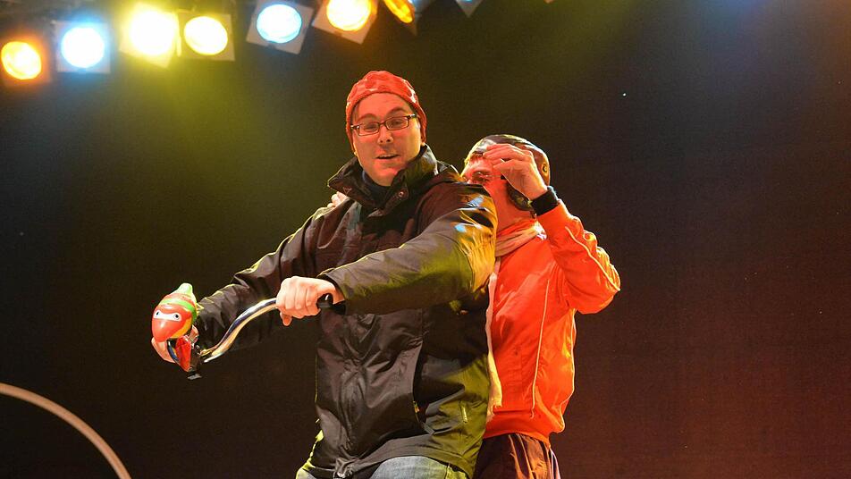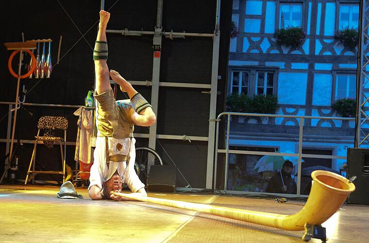 "Uns fehlt der Schirmherr: OB Franz Stumpf ist in Le Perreux", scherzte Hubert Forscht, Vorsitzender des Jungen Theaters, bei seinem Grußwort. 400 Forchheimern war das egal - sie drängten sich unter Pavillons vor der Bühne zusammen oder verfolgten unter Schirmen und Kapuzen die gut zweistündige Auftaktveranstaltung. Künstler wie der genial-schräge Clown Jeff Hess ("Ich bin Jeff Hess und ihr nicht!") oder Stefan Sing und Cristina Casadio mit ihrer rasant getanzten Balljonglage wärmten die Herzen und vertrieben den Regen irgendwann völlig.