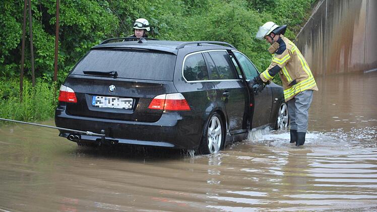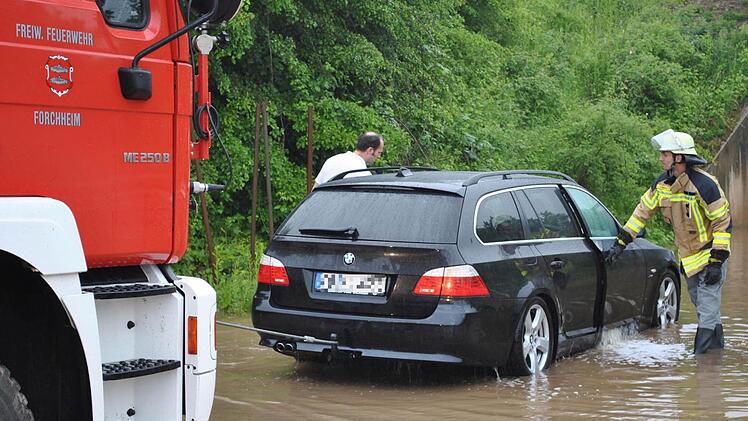 Trotz eindeutiger Warnbeschilderung steuerte am Samstag ein Autofahrer in die überflutete Unterführung auf dem Betriebsgelände der Firma Pleil im Forchheimer Norden. Es kam, wie es kommen musste: Das Fahrzeug blieb wegen des hohen Wasserstandes in der Unterführung stecken.