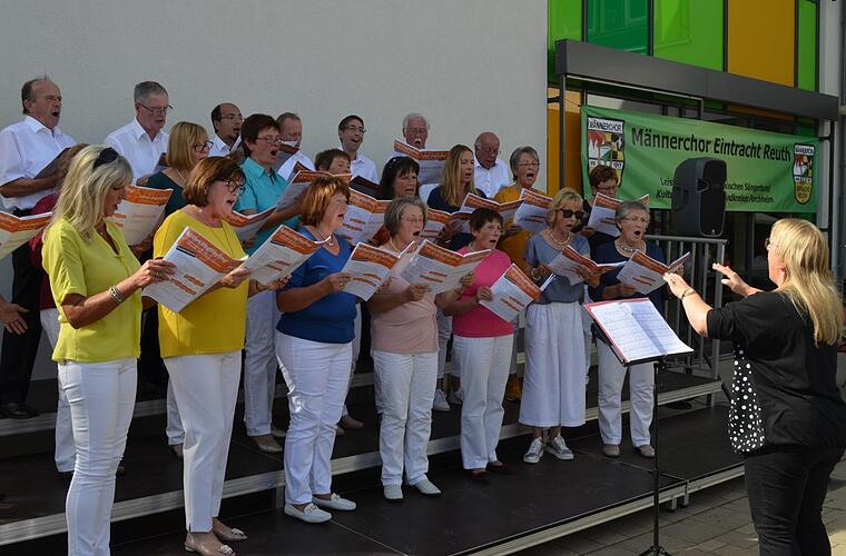 Anschließend durfte mitgesungen werden, als der Männerchor unter der Leitung des Regionalkantors Erich Staab (St. Xystus Erlangen-Büchenbach) das erste Lied "Auf uns" von Andreas Bourani anstimmte. Nach "Bel ami" und "An jenem Tag" betrat der Chor des Gesangvereins Cäcilia-Lyra Weilersbach die Bühne, welcher dann von den Sängerinnen und Sängern des Gesangvereins Kersbach abgelöst wurde. Den Abschluss machte noch einmal der Reuther Chor, in dem er alle begeisterten Hobbysänger zum gemeinsamen Schlusslied "Wohlauf, die Luft geht frisch und rein" anstimmte, welches bestimmt in dem einen oder anderen Garten in Reuth noch zu hören war. In geselliger Runde bei Kaffee und Kuchen klang das Fest dann am frühen Abend aus.