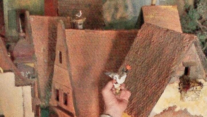 Das Malen ist dem pensionierten Landratsamts-Mitarbeiter Rainer Schrüfer ein Bedürfnis. Die große Leidenschaft des Hobby-Künstlers ist aber seine acht Quadratmeter große Krippe ganz nach Motiven des Biedermeier-Malers Carl Spitzweg. Hier bringt der Klapperstorch das Christkind.