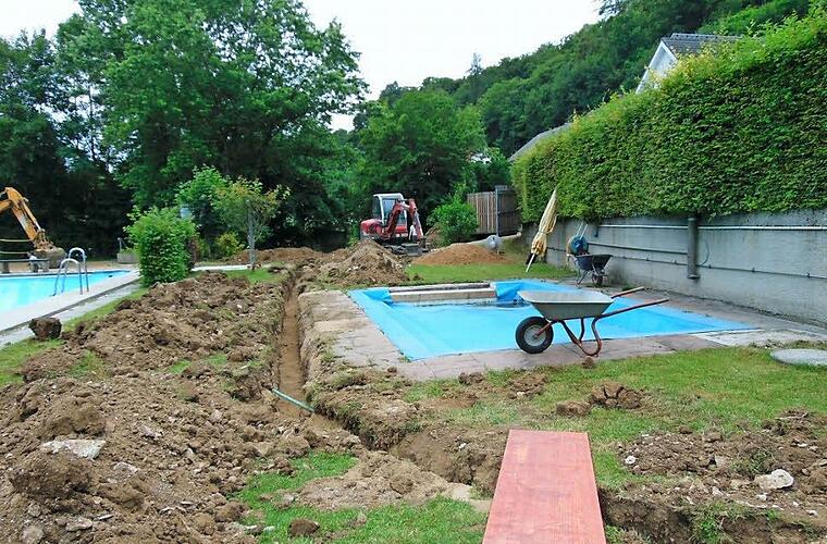Die Gräben für die Wasser- und Stromleitungen geben dafür Zeugnis. Ein Graben ist gedacht für das Starkstromkabel, das quer von der Toilette hinter der Rutsche entlang verlegt wird. Der große Bagger allerdings ist hinter dem Schwimmbecken beschäftigt, schlägt seine Schaufel in den Boden und befördert eine Schaufel Erde nach der anderen weg.