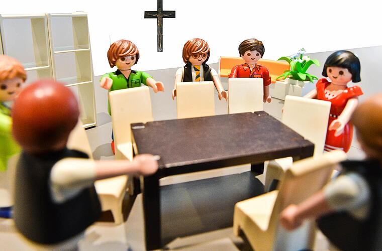 In Ebermannstadt wird vor jeder Stadtratssitzung gebetet. Anlässlich des 40. Geburtstag von Playmobil wurde die Szene mit den bunten Männchennachgestellt. Foto/Grafik: Michael Karg