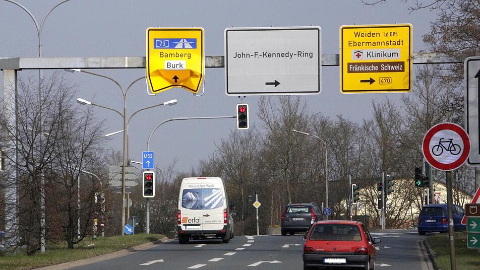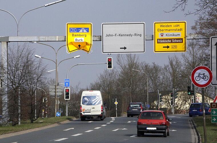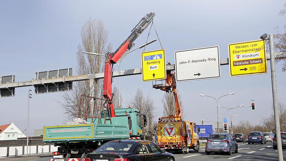Eineinhalb Monate machte der Wegweiser auf die Autobahn A 73 Richtung Bamberg und die Zusatzbeschriftung, dass es auf der Adenauerallee weiter in Richtung Burk geht, einen recht verknitterten Eindruck. Der Fahrer eines Wagens des städtischen Bauhofes hatte den ausgefahrenen Ladekran nicht wieder eingezogen und war an der Schilderbrücke bei der Abzweigung zum John-F.-Kennedy-Ring hängen geblieben. Jetzt wurde das Schild ausgetauscht.