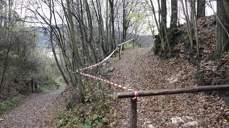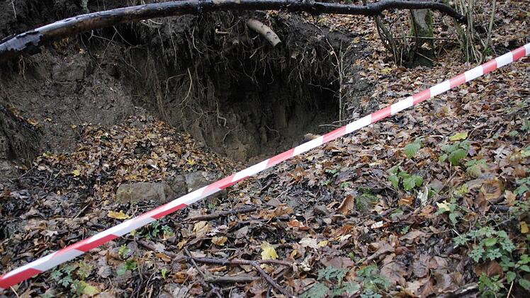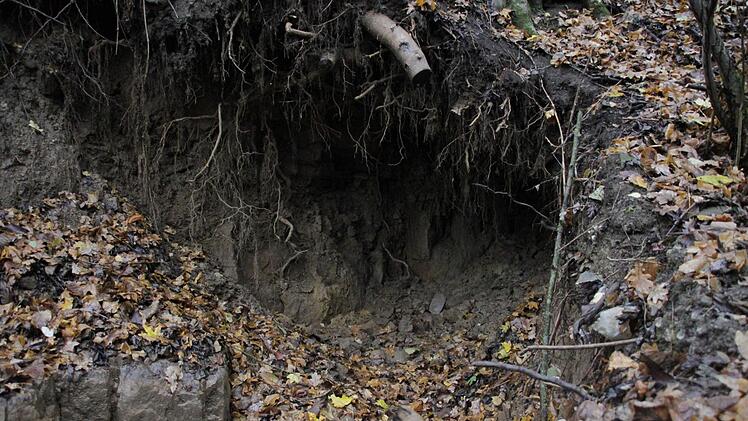 Über Nacht ist einer der in den Sandstein gehauenen Keller an der "Hummerleite" am nördlichen Ortsrand von Gasseldorf eingestürzt. In dem Berghang klafft ein mehrere Kubikmeter großes Loch; Wurzeln hängen in der Luft. Damit niemand hinein fällt, wurde der Bereich weiträumig mit rot-weißem Flatterband abgesperrt.