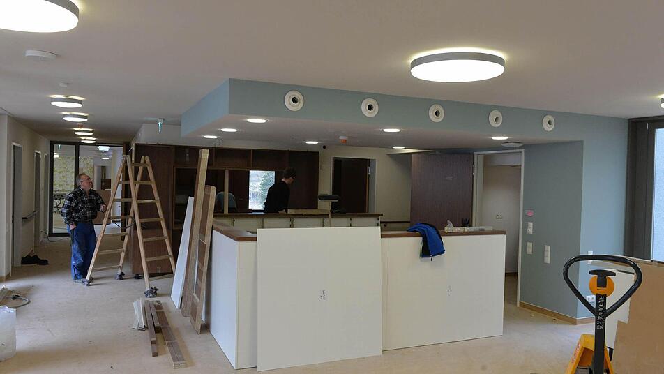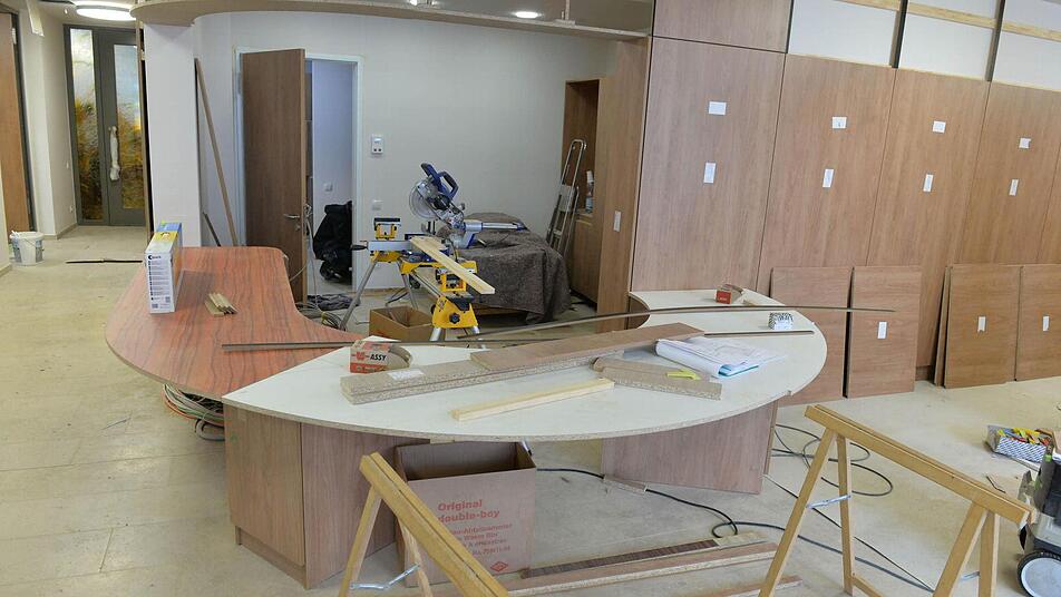 Kurz vor der Weihe herrscht noch Hochbetrieb auf der Großbaustelle. Der Schreiner ist dabei, dem Empfangsraum den letzten Schliff zu geben. Hier werden die Gäste empfangen, erfahren die erste Orientierung im Haus durch die Fachkräfte.