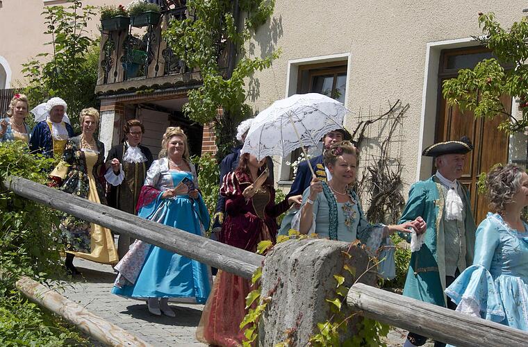 Die Mitglieder der Gößweinsteiner Tanzgruppe "Les nouveaux danseurs de baroque" fühlen sich in ihren ausgestellten Kleidern und Anzügen besonders wohl. Man bewege und verhalte sich einfach anders, sagen sie.