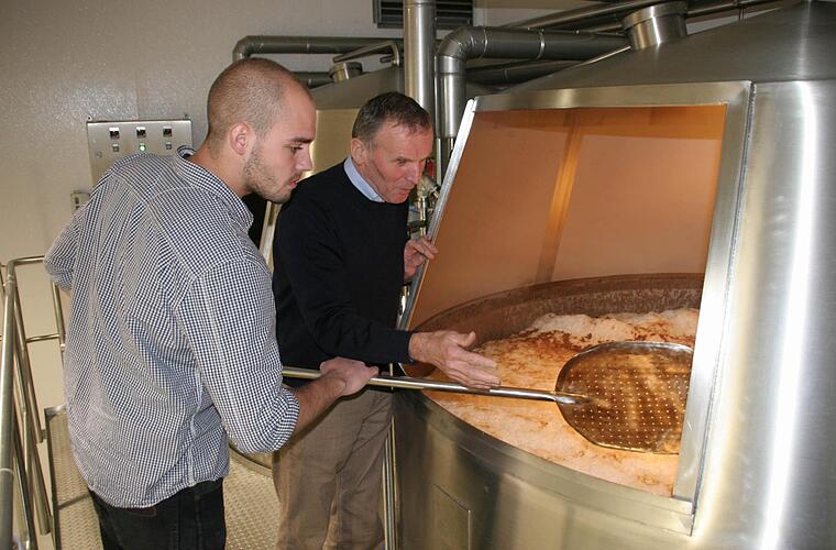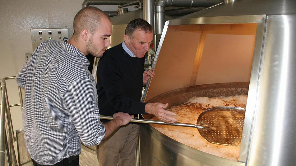 An der Zapfanlage   Im weiteren Verlauf mussten die drei jungen Leute ihr Wissen im Umgang mit dem Sudkessel beweisen, wo das zerkleinerte Malz eingemaischt und unter Zugabe von Hopfen zum gehopften Zuckerwasser, Würze genannt, wird. Anschließend testeten die Prüfer um den Verbandsvorsitzenden Stefan Stang die Fertigkeiten der Prüflinge an den Gärtanks, wo der Würze die Hefe beigemengt wird und während des bis zu acht Tage dauernden Gärprozesses Zucker und Hefe in Alkohol und Kohlendioxid umgewandelt wird.