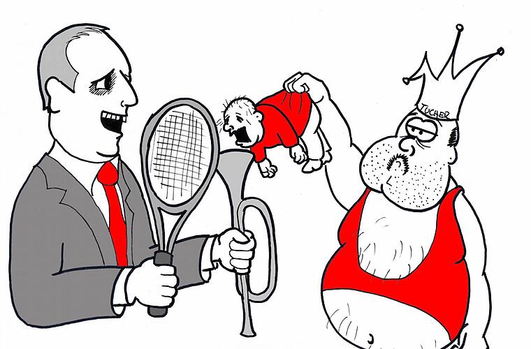 Hümmer Eine Darstellung, in der der Forch als der wahre Regent unserer Stadt mir seine Gunst erweist, in dem er mir im Rathaus den Amtseid als OB abnimmt, während im Hintergrund der Rathauspöbel meinen Mitbewerbern unter dem Tisch die Schnürsenkel verknotet.