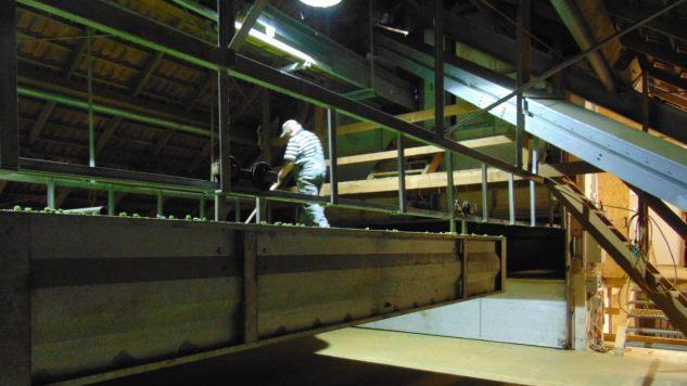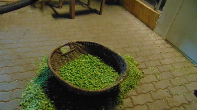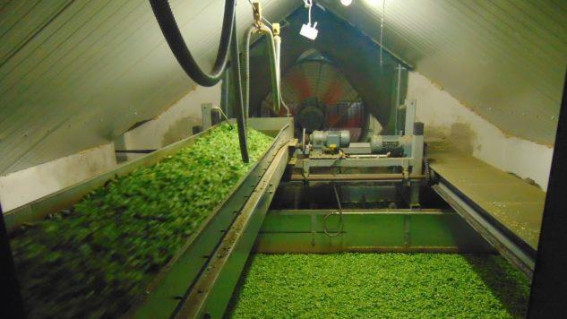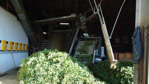 Durch die Maschine gezogen, wird die Rebe bearbeitet, die Dolden von den Blättern und Geästen getrennt. Fünf Meter hoch ist die Hopfenmaschine, die mit Walzen die Reben bearbeitet und auf Förderbändern die Dolden zum nächsten Arbeitsschritt befördert, bis sie im Vorratssilo landen und dann in die Trocknung gefüllt werden.