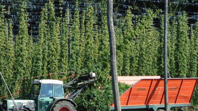 Marek, ein Saisonarbeiter aus Polen, lenkt den Traktor langsam an der Hopfenreihe entlang. 1,45 Meter sind die einzelnen Stöcke jeweils voneinander entfernt. Am Traktor ist ein Abreißgerät befestigt, das vorne ein Messer hat. "Die Rebe wird nun durch den Kettenzug im Abreißgerät hochgezogen und oben festgehalten", erklärt Franzi Merkl. Sie ist die Tochter des nach Biohopfenanbauer Franz Friedrich und zugleich die Juniorchefin des Betriebs. Nach Angaben des Deutschen Hopfenpflanzerverbands in der Hallertau gehört Friedrich zu Deutschlands zwei größten Anbauern von Biohopfen.