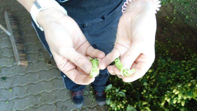 Der junge Hopfen ist noch zart und wird seine Wurzeln verstärken. Erst im zweiten oder dritten Jahr ist er von dem anderen Hopfen nicht mehr zu unterscheiden. Viele der Hopfenstöcke auf Friedrichs Flächen sind schon 20 Jahre alt. Nur alte Sorten, die nicht mehr vermarktet werden können, werden vom Feld genommen.