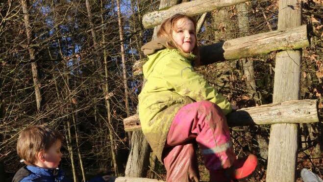 Pädagogin Lisa Sandner erklärt: "Wir setzen hier im Waldkindergarten auf viel freies Spiel und nicht auf Spielzeug. Das ist viel besser für die Phantasie. Ein weiterer Vorteil ist, dass dies auch der Sprache zu Gute kommt, weil immer alles erklärt wird, was die Kinder gerade so machen." Sandner selbst genießt die Natur und mag ihre Arbeit: "Ich wollte draußen sein und es herrscht dort auch weniger Lärm als in normalen Kindergärten." Die Mädchen und Jungen haben wie selbstverständlich die Natur zu ihrem großen Spielzimmer gemacht. Ganz ohne Angst klettern sie geschickt auf einen Hochsitz und streicheln ihre "Waldkatze", die ohne Scheu umherläuft. "Sie besucht uns fast jeden Tag und ist ganz brav", meint Eric.