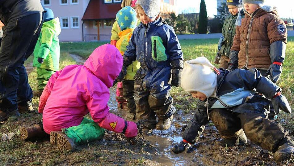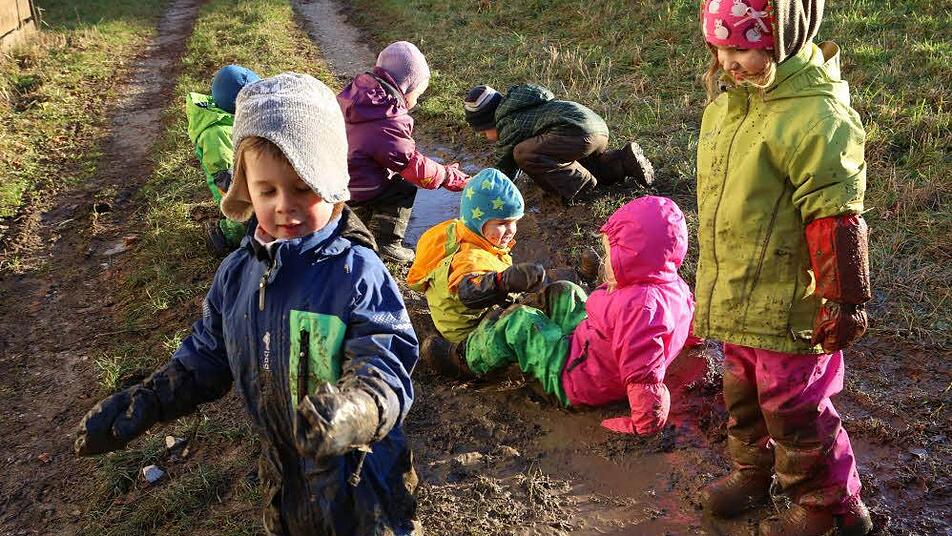 Sonne, zwei Grad über Null und Natur pur! Timo (3) und Emma (4) patschen mit ihren Händen in die tiefe, braune Pfützen, lachen und springen dann sogar mit ihren Gummistiefelchen ins kalte, seichte Nass. Beide genießen das Herumtollen - jeden Tag sind sie zusammen mit acht weiteren Jungen und Mädchen draußen. Sie gehören zum Kindergarten Waldstrolche in Serlbach.