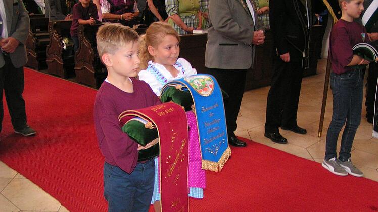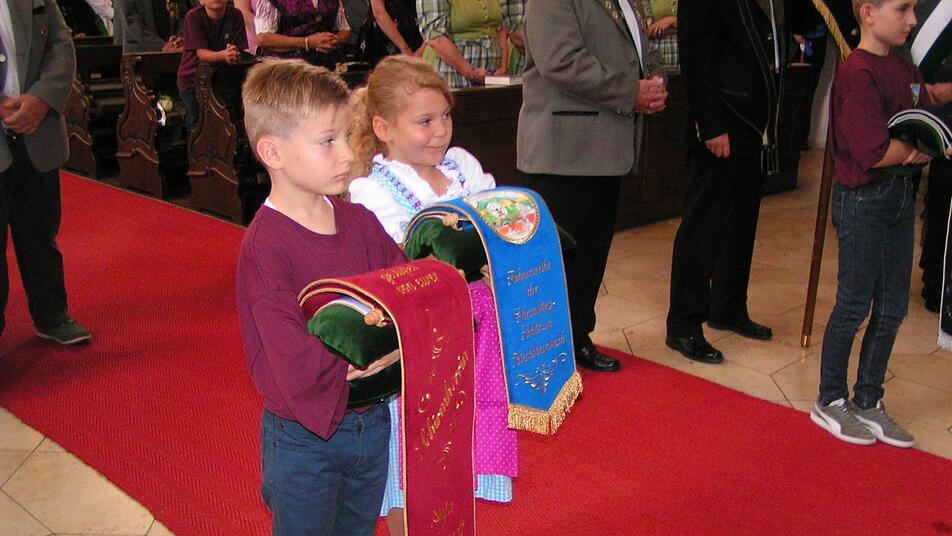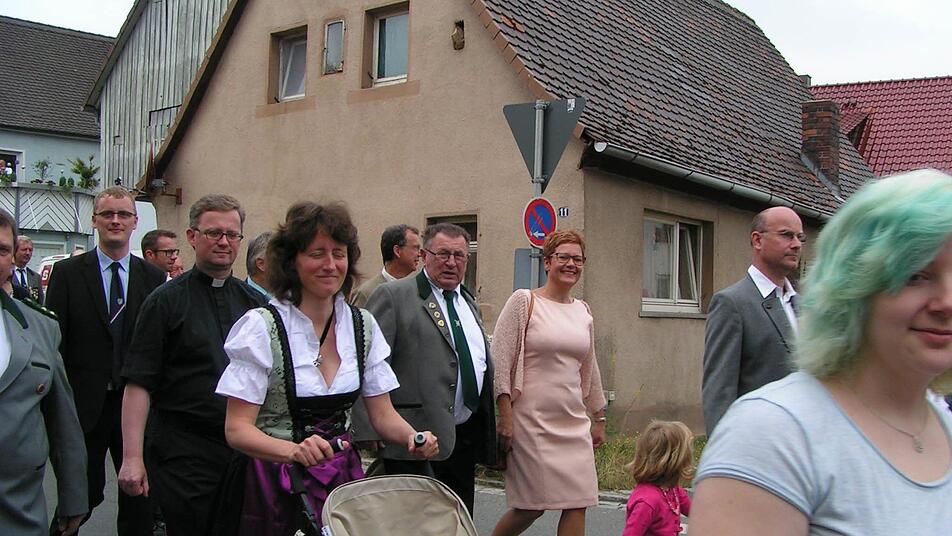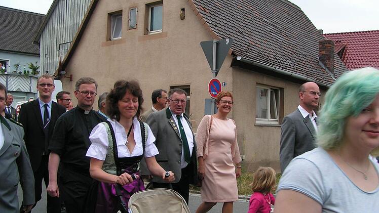 Bevor Thomas Hofbüker stellvertretend für Fähnrich Herbert Schmitt das neue Vereinsjuwel entgegennahm, wurde es von Pfarrer Oliver Schütz feierlich gesegnet. Ebenso feierlich wurden die Erinnerungsbänder an die Fahne geheftet. Für das Gelingen ihres Festes hatte die Schützengilde keine Mühe gescheut. Nach dem Gottesdienst hieß es für die Festteilnehmer dann: "Im Gleichschritt marsch". Und zahlreiche stolze Schützen, Trachtler, Feuerwehrleute und viele mehr marschierten, begleitet von dem klingenden Spiel der "Ehrabocher Jugendkapelle" mit Wojciech Grabietz zum Festzelt. Mittendrin: Schirmherrin Bürgermeisterin Anja Gebhardt, Vizelandrätin Rosi Kraus, Pfarrer Oliver Schütz und zahlreiche Vertreter aus Politik und Kirche.