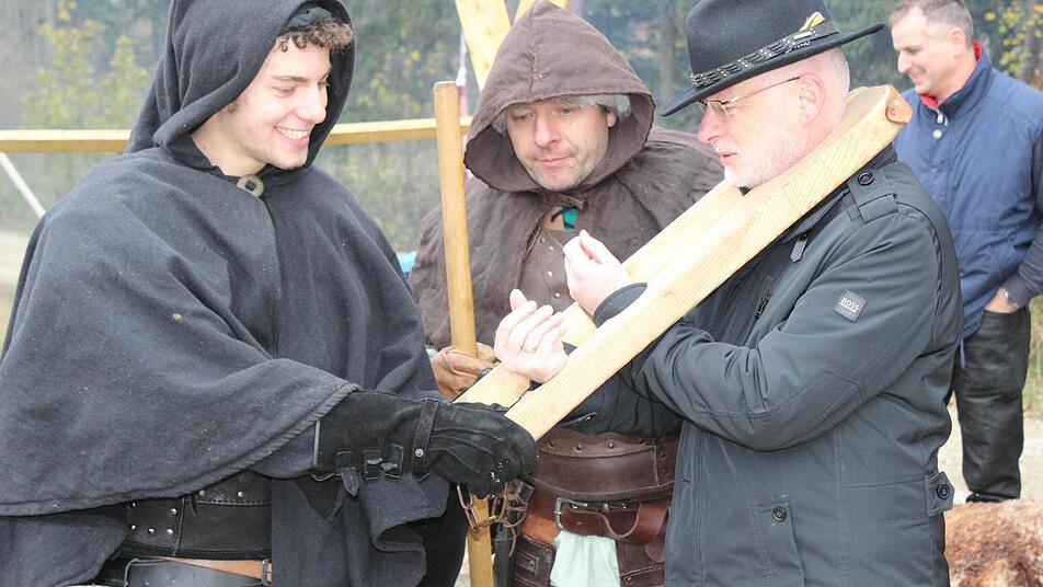 Von der "Ritterschaft zur Hainburg" stilvoll umrahmt, die später auch für die Verköstigung und Liedbeiträge sorgte, hatten sich zu einem kleinen Festakt auf den nasskalten Anhöhen neben dem Igensdorfer Bürgermeister Wolfgang Rast (IU) auch der Kulturreferent des Landkreises Forchheim, Toni Eckert, Vizelandrat Georg Lang (CSU) sowie Rudolf Landmann vom Fachzentrum für Diversifizierung und Strukturentwicklung beim Amt für Ernährung, Landwirtschaft und Forsten in Münchberg eingefunden. Sie bestaunten das Kulturprojekt, das bei förderfähigen Kosten von 28.000 Euro mit einem Leader-Zuschuss von 12.000 Euro ausgestattet wurde.