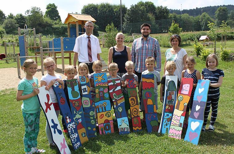 Heiligenstadt ihre Werke: Die Kinder vom Haus für Kinder stellten der interessierten Öffentlichkeit ihre ersten Werke vor. Im Rahmen des Jahresthemas "Kunst in Kinderhand", hatten die Mädchen und Jungen Werke nach Art des Künstlers Friedensreich Hundertwasser auf Zaunlatten gestaltet.