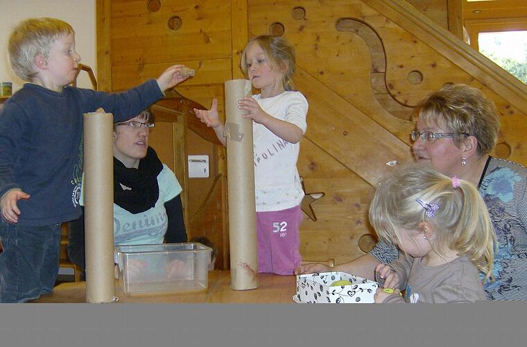 Am anderen Tisch hält der vierjährige Rune ein Rohr aus Pappe und wirft begeistert Korken hinein.