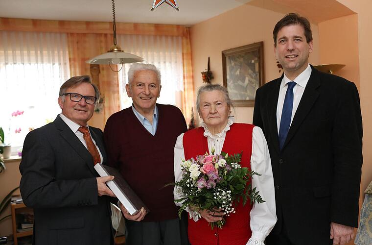 In Heinrich Turnwalds Augen blitzt noch der Schalk auf, wenn er mit Landrat Hermann Ulm (CSU) und Bürgermeister Reinhard Seeber (CSU/BB) über tagesaktuelle Themen diskutiert. Ulm überbrachte die besten Wünsche des Landkreises Forchheim. Seeber überreichte dem Jubelpaar ein Buch, das der bayerische Ministerpräsident Horst Seehofer (CSU) mit den besten Wünschen aus München schickte. "Ich bin froh, dass wir so einen gütigen Gott da oben haben", sagt die Jubilarin.