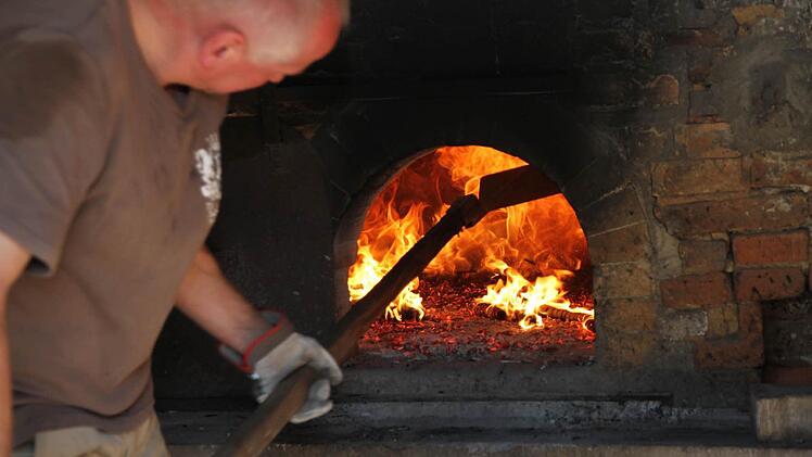Bevor die nächsten Kuchen in den Ofen können, müssen die drei Schürmeister Martin Saffer, Thomas Schwarzmann und Georg Bähr den Ofen erst wieder mit neuen Reisigbündeln aufheizen. Sie haben an diesem Tag den schweißtreibensten Job.