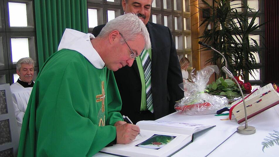 Es war ein feierlicher Anblick: Die Wallfahrtskirche war dicht gefüllt, die Fahnenabordnungen der Ortsvereine hatten sich im Altarraum aufgereiht und der Frauenchor sang unter Organist Hans Knauer "Da knie ich Maria", als ein sichtlich bewegter Pfarrer Möckel all dem.