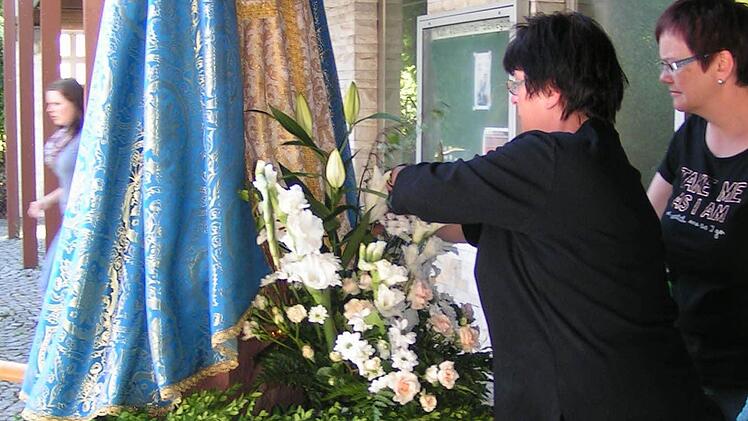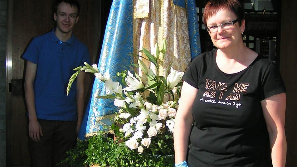 Noch den kostbaren Brokatumhang um die Marienstatue und ein kleines Blumensträußchen in die Hand des Jesuskindes. Eine Girlande, ein paar Blumen, und die Heiligenfigur ist prächtig geschmückt für das Fronleichnamsfest.