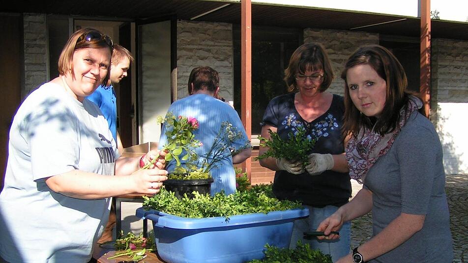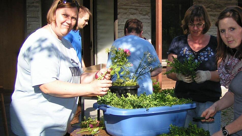 Und das machten sie mit viel Liebe und Harmonie. Da wurde geschickt Hand in Hand gearbeitet. Buchszweige mussten zu Girlanden gebunden werden, Efeu und vielerlei Blumen wie Rosen, Nelken, Gladiolen und Lilien sortiert, in Form geschnitten und zusammengesteckt werden.