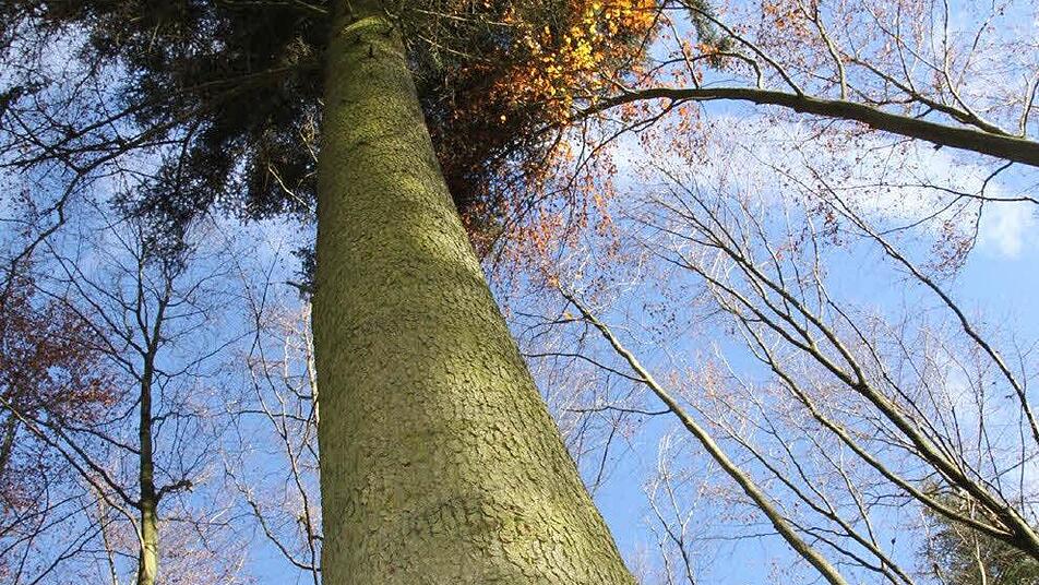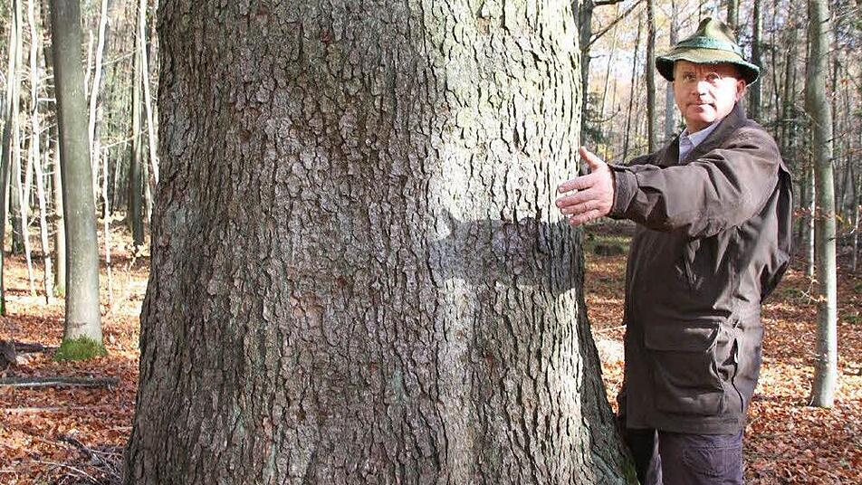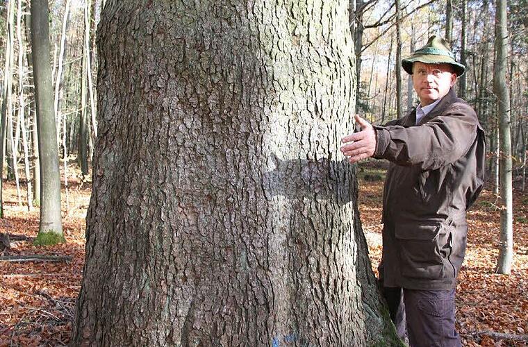 Kein Wunder, dass diese über 300 Jahre alte Weißtanne einer der Lieblingsbäume von Förster Erich Daum ist. Er führt bei Waldbegehungen gerne Kinder aus dem Kindergarten oder der Schule dorthin. Obwohl es vieles zu bewundern gibt in "seinem" Wald. Das Gebiet, für das er zuständig ist, die "Untere Mark", umfasst ein Areal von etwa 2000 Hektar. Die Größe entspricht in etwa 3500 Fußballfeldern. Doch Weiß-Tannen findet man darin wenige, nur etwa zwei bis drei Prozent sind im Bestand. So alte und große sind eine Seltenheit. "Die Folgen der großen Luftverschmutzung in den 60er- und 70er-Jahren und enormer Schädlingsbefall führten bei uns zu einem großen Tannensterben", erklärt Daum.