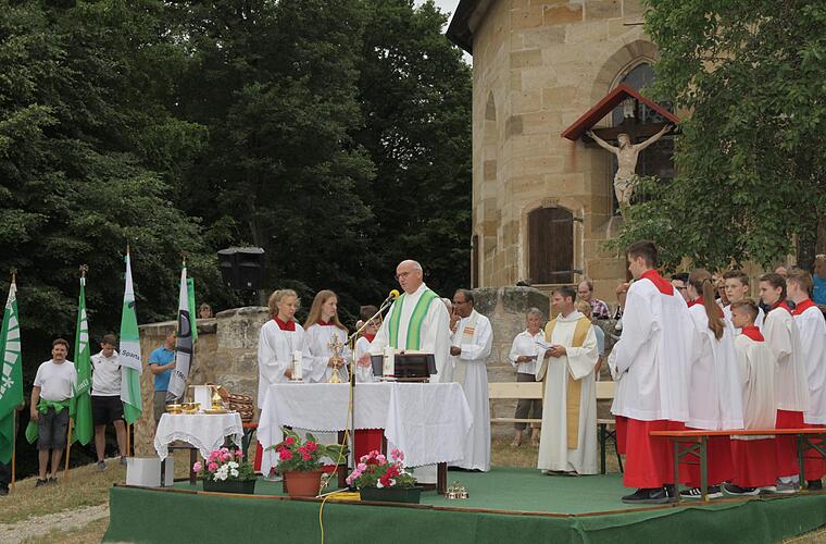 An der Kreuzbergkirche angekommen, zelebrierte der geistliche Beirat des DJK-Diözesanverbandes, der Herzogenauracher Stadtpfarrer Helmut Hetzel in Konzelebration, mit dem örtlichen Pfarrer Matthias Steffel und Pater Augustin eine Messe unter freien Himmel. Sie wurde musikalisch umrahmt von der Band "Shalom" aus Kersbach.