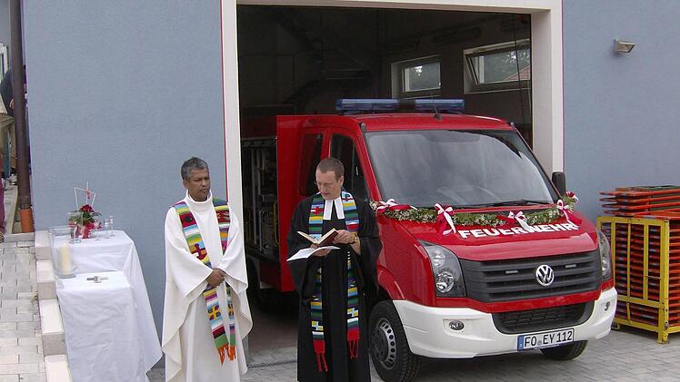 Bei der Einweihung standen einige Feuerwehrleute in ihren Festanzügen vor der Garage und lauschten wie auch die anderen Gästen den Worten der beiden Pfarrer Hardt und Kaplan Jimmy. "Gott zur Ehr', dem nächsten zur Wehr", zitierte Hardt dabei einen Spruch, der das Selbstverständnis der Feuerwehr gut auf den Punkt bringe.