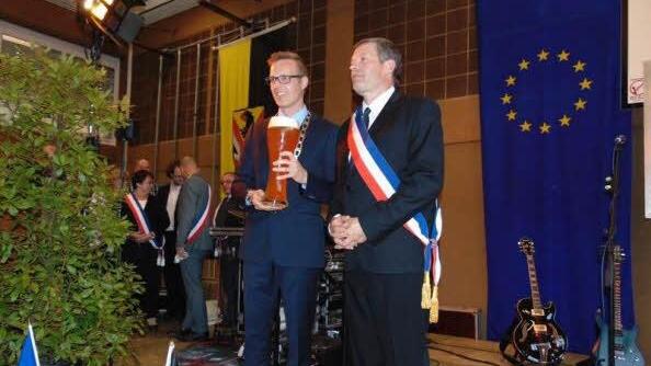 Bürgermeister Bezold hatte ein passendes Präsent für seine französischen Freunde besorgt. Denn die Bürger aus Clairoix trinken durchaus gern Weizenbier. Mit einem Weizen im Zwei-Liter Glas stießen die beiden Bürgermeister auf die vergangenen Jahre und die Zukunft der Freundschaftb . Das Besondere an dem Glas: Wenn das Bier leer getrunken ist, erscheinen auf dem Glas die Wappen der beiden Partnervereine.