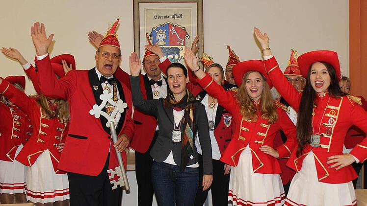 Mit einem dreifachen "EBS, aha" stürmte der Elferrat Ebermannstadt mit seiner Jugendgarde das Rathaus. Dort wurden sie schon von einer sichtlich beschwingten Bürgermeisterin Christiane Meyer (NLE) und ihren Stadträten erwartet.
