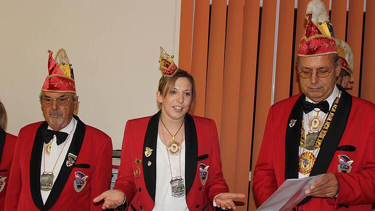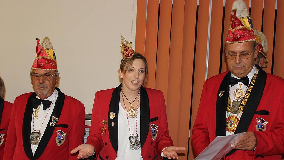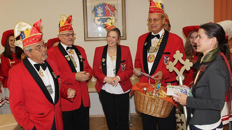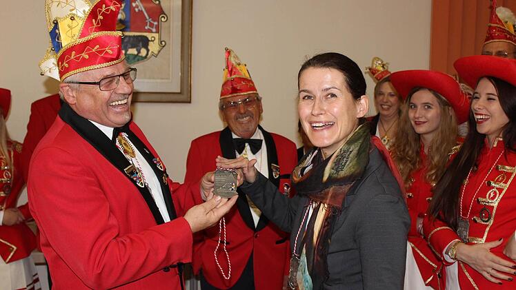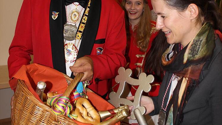 Bürgermeisterin Christiane Meyer durfte den neuen Orden zumindest einmal kurz berühren. Verliehen bekommt sie ihn erst bei der Prunksitzung am 10. Januar. Der Fresskorb von Elferratspräsident Roland Hofmann war gut gefüllt, sodass sich die Ebermannstadter Narren und auch die Bürgermeisterin noch ein Gläschen Sekt gönnen konnten.