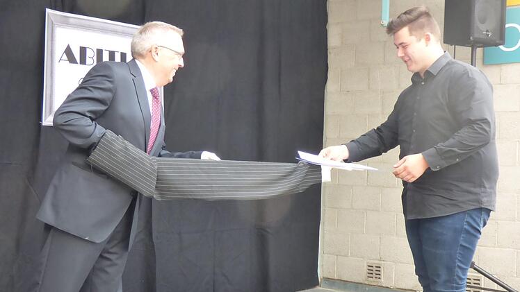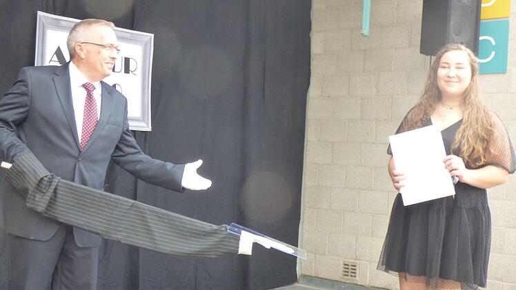 Um den Mindestabstand von 1,5 Metern einzuhalten, überreichte der Leiter des Gymnasiums Fränkische Schweiz den Absolventen die Abschlusszeugnisse mit einer Konstruktion, die zum Schmunzeln brachte.