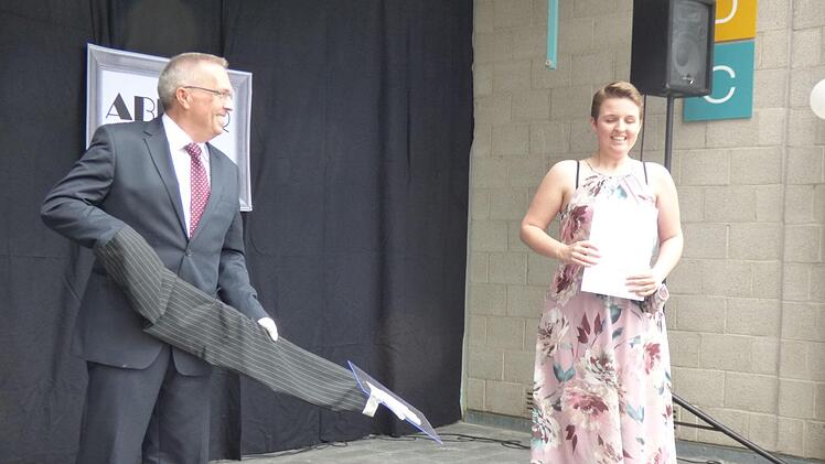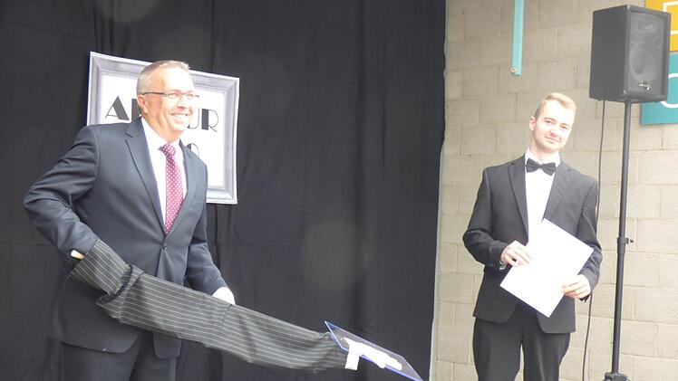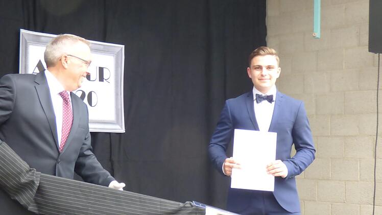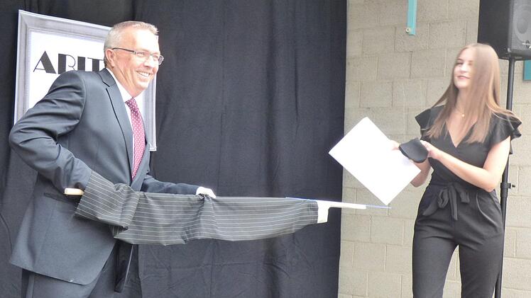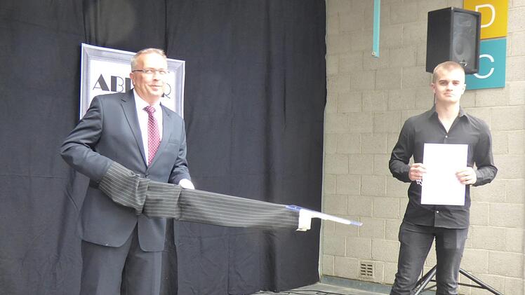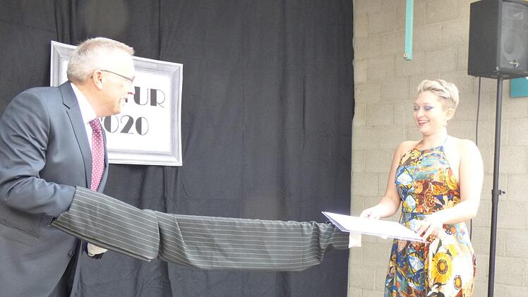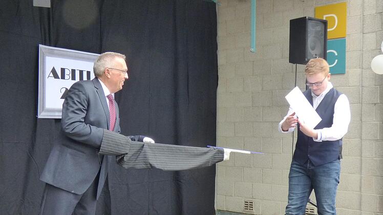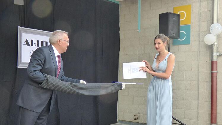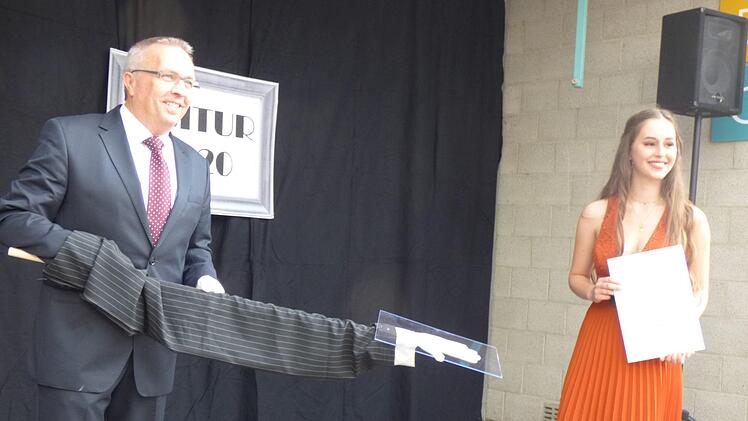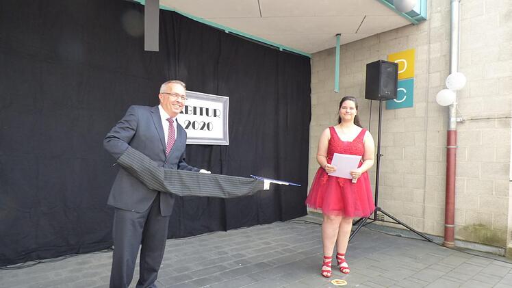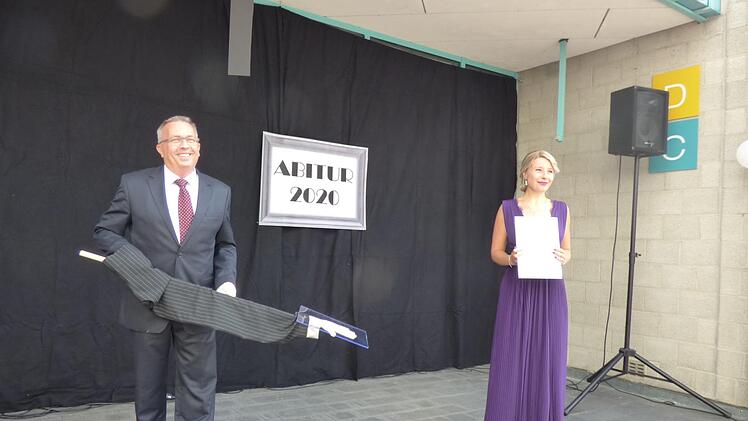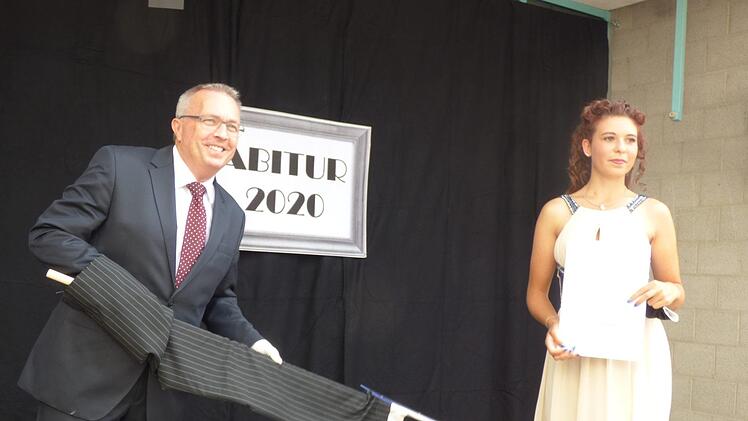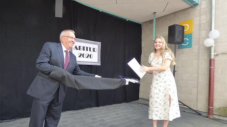 So richtige Feierstimmung, wie sonst üblich bei den Abibällen in der Stadthalle, kam dabei nicht auf. Eigentlich war es nur eine Zeugnisübergabe, die ebenfalls aus eineinhalb Metern Entfernung stattfand. Die Abschlusszeugnisse wollte der Schulleiter, nicht wie ursprünglich diskutiert, auf einem Tischchen ablegen, sondern trotzdem persönlich übergeben. Reck hatte deshalb eine witzige Idee, indem er sich eine Art verlängerten "Direxarm" gebastelt hatte, mit dem er den Absolventen die Urkunden übergab.