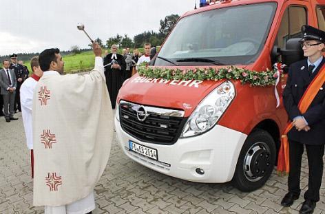 Nach dem ökumenischen Gottesdienst im Saal des Gemeinschaftshauses segneten Kaplan Cyriak Chittukalam und der evangelische Pfarrer der Christuskirche Axel Bertholdt das neue Fahrzeug.