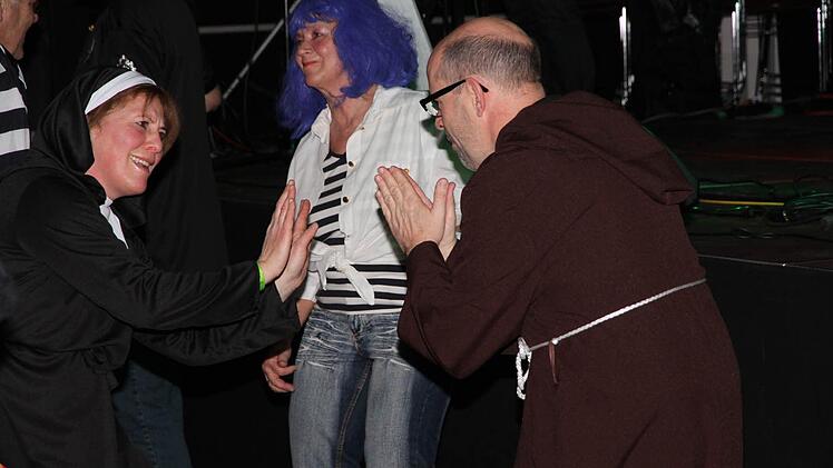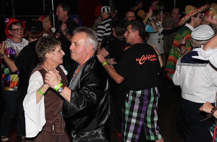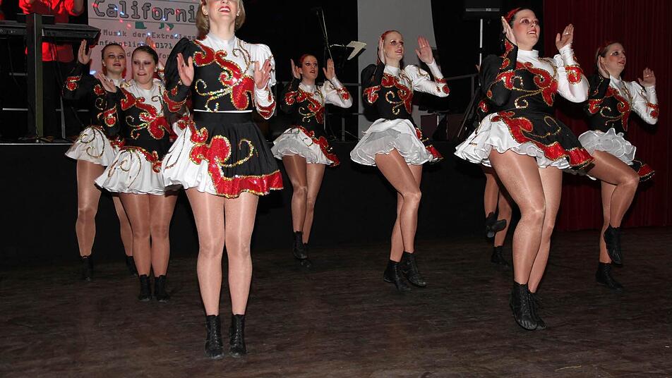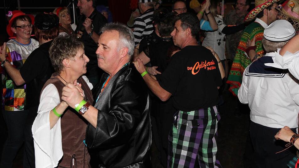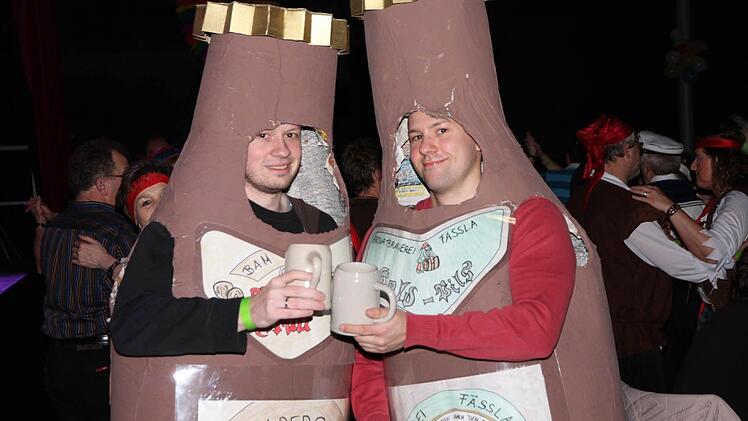 Zum Tanz spielte das Duo "California" auf, die Showtanzgarde aus Heubach bei Ebern unter der Leitung von Petra Elflein führte einen Garde - und einen Showtanz auf. Eine originelle Verkleidung hatten Sebastian Bähr und Thomas Starklauf gewählt: Sie kamen als lebendige Bierflaschen. Doch das Tanzen fiel in dieser Kostümierung etwas schwer, auch hinsetzen war nicht möglich. "Aber trinken geht", trösteten sich die beiden Eggolsheimer. Durften sie auch an diesem Abend, denn sie waren zu Fuß gekommen. Ins Auto hätten sie auch nicht gepasst.